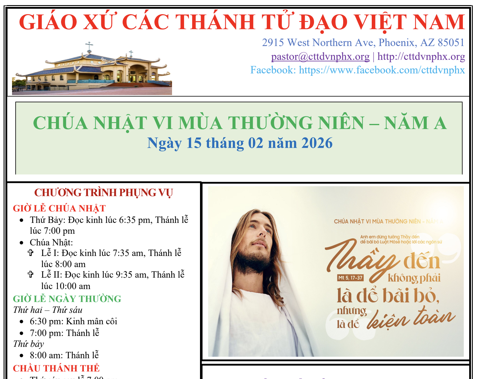 Xin gởi đến quý ông bà anh chị em bản tin Chúa Nhật VI Mùa Thường Niên - Năm A.
